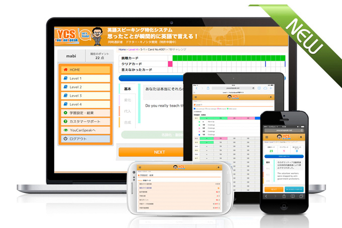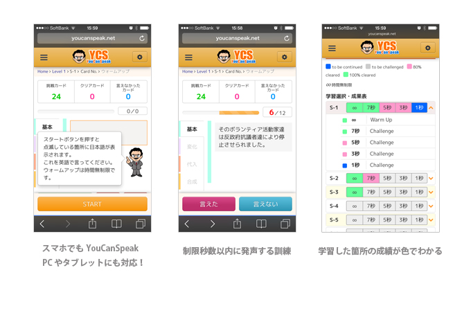 YouCanSpeakはオンライン学習画面内に例文を2,496用意している上、模範解答英文と音声を瞬時に確認することができます。どのCDの音声がどの例文と紐づいているのか探す必要もありませんし、全ての学習をブラウザ(閲覧ソフト)で行うことができるので、テキスト本を持ち運ぶ必要もありません。学習にはインターネット接続が必須ですが、様々な端末(PC・スマホ・タブレット)から学習進捗状況を更新することができ、日本国内のみならず、海外からでも瞬間英作文にチャレンジすることができます。